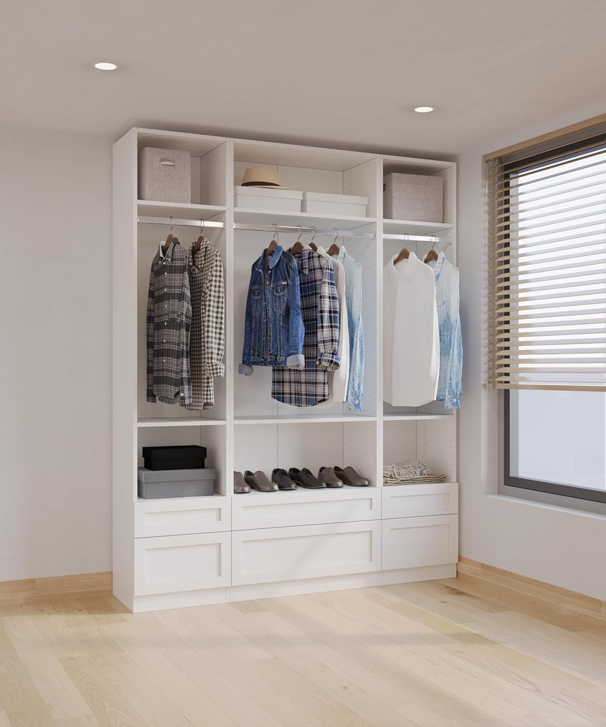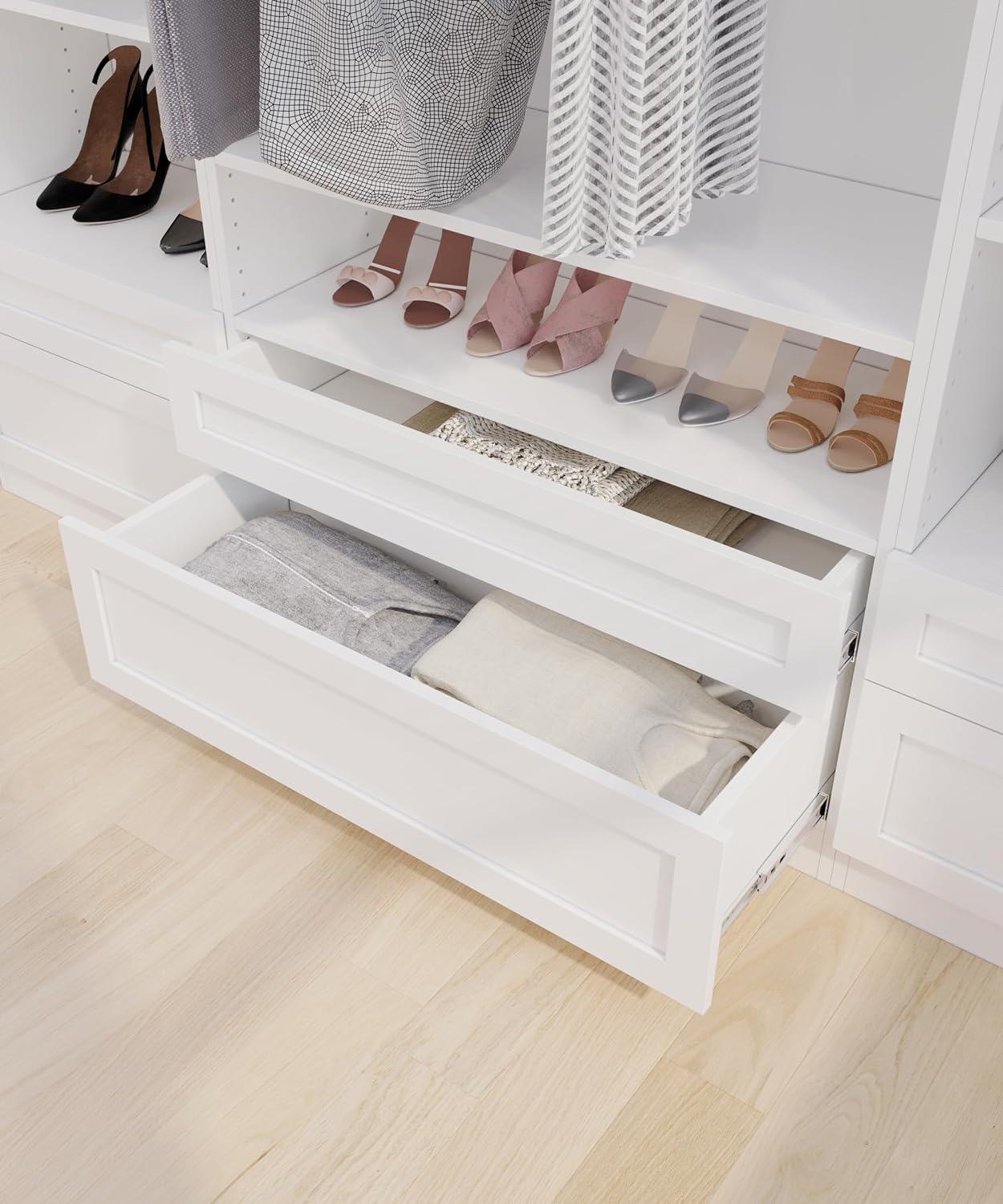 The Drawer Unit boasts dimensions of featuring a well-thought-out layout with 1 medium drawer (6″Height) and 1 large drawer (10″Height). Its compatibility extends to both JY freestanding and wall-mounted closets, allowing you to mix and match according to your space requirements.