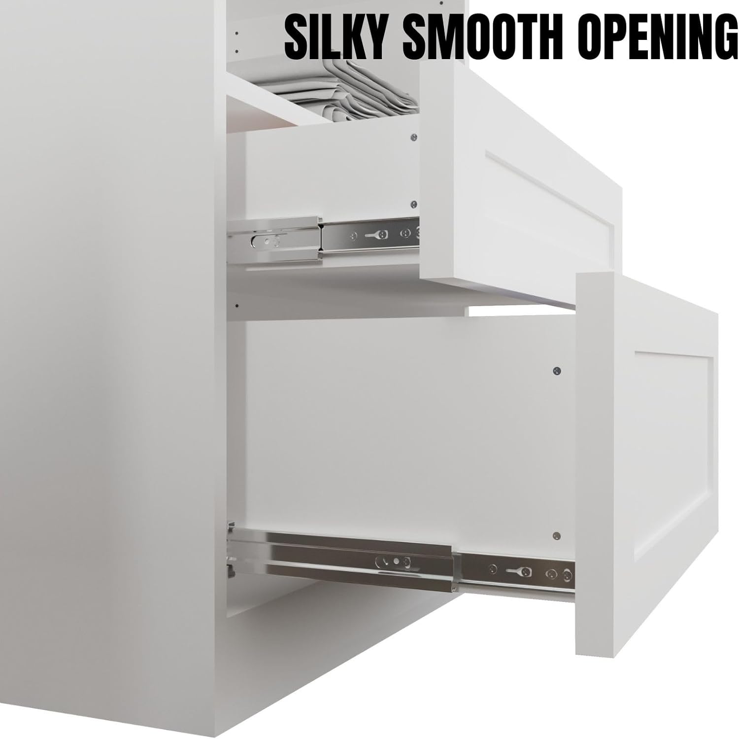 Equipped with Shock Absorber Drawer Sliders, our drawer unit provides a noise-reducing closing mechanism. The design, free from handles, allows convenient access by pulling from both sides, offering a seamless and quiet user experience.