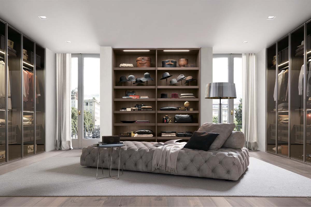This walk-in closet adorned with WILLOW features luxurious design elements that redefine opulence. The hanging door in cranberry glass introduces a touch of richness and sophistication, creating a focal point that captures attention. This bold design choice adds a unique dimension to the wardrobe, elevating it beyond mere functionality. The varnished Anthracite accents further contribute to the luxurious ambiance, creating a harmonious interplay of colors and textures. Each element within this wardrobe is a testament to meticulous attention to detail and a commitment to creating a space that exudes elegance. WILLOW becomes the unifying thread, seamlessly tying together these design elements into a cohesive and visually stunning walk-in closet.