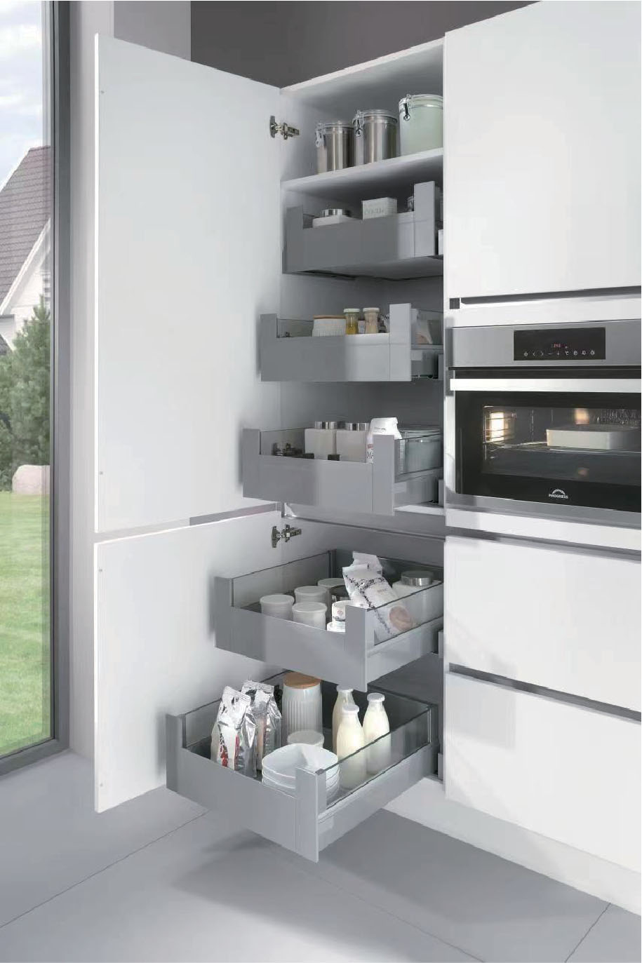 Embark on a journey of modern simplicity and functionality with GLOSSY WHITE kitchen cabinets. These cabinets, adorned with clean lines and devoid of frills, emanate a contemporary feel that redefines the essence of a modern kitchen. The flat door panels and straightforward handle design emphasize functionality and neatness, making GLOSSY WHITE cabinets ideal for kitchens where practicality and a clear layout take precedence. Unlike traditional drawers, the rebound drawer introduces an automatic rebound feature, providing a seamless and effortless experience. This design not only enhances the smoothness of drawer operation but also alleviates pressure, particularly when managing items with both hands. Let’s explore the innovative features and multi-layered storage structures of GLOSSY WHITE cabinets that elevate your kitchen into a realm of modern elegance and efficiency.